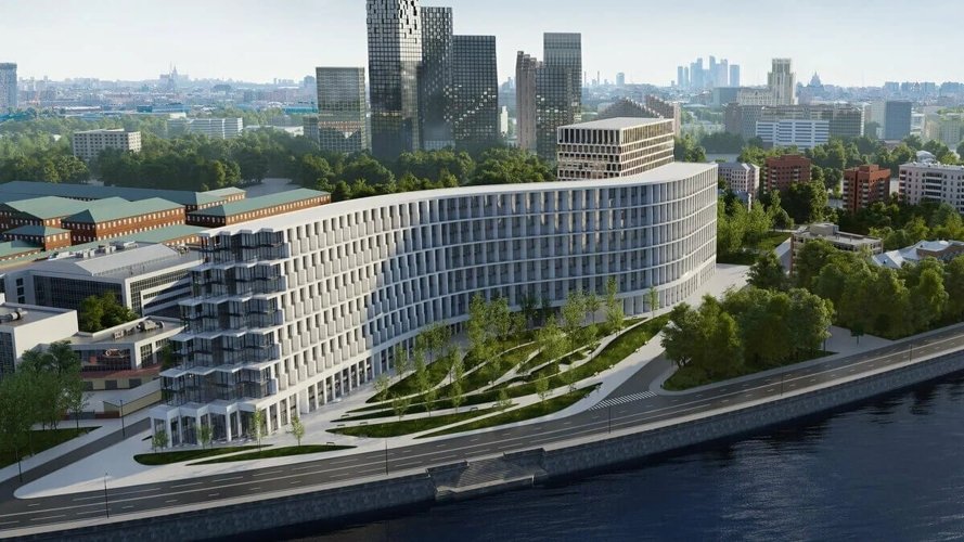 11‑этажный монолитный дом из 6 секций в форме волны — аллюзия на изгиб Москвы‑реки (бюро «Цимайло Ляшенко и Партнёры»). Фасад из матового архитектурного бетона, панорамное остекление, ступенчатые террасы. Каждая секция отличается контуром фасада и типом окон.