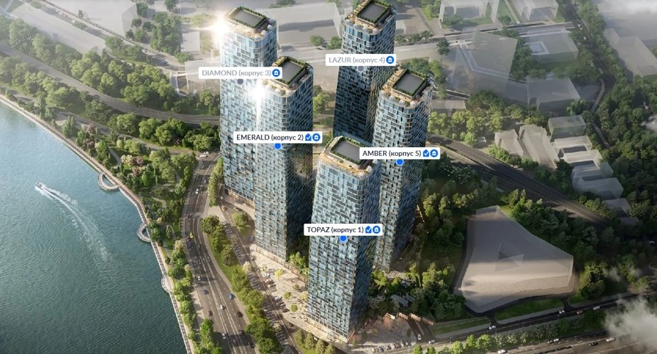 ЖК River Park Towers Кутузовский — это квартал у воды, где футуристическая архитектура встречается с природным комфортом. Пять небоскрёбов (45–46 этажей) с именами драгоценных камней (Topaz, Emerald, Amber, Diamond, Lazur) выстраиваются вдоль Москвы‑реки напротив Москва‑Сити, создавая ощущение вертикального города будущего